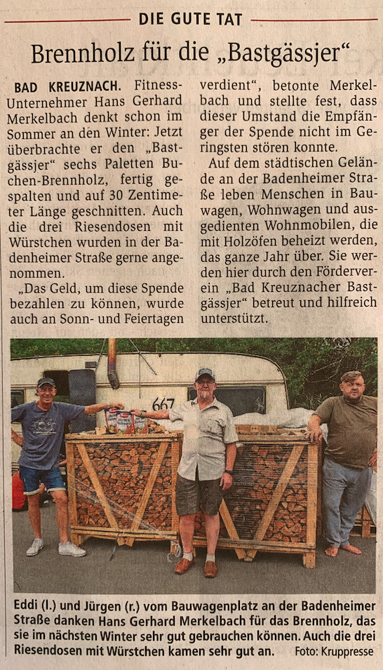 Hans Gerhard Merkelbach liefert Brennholz für Bastgässjer.Hier ein Ausriss aus der Allgemeinen Zeitung, Bad Kreuznach, vom 26. Juli 2020.